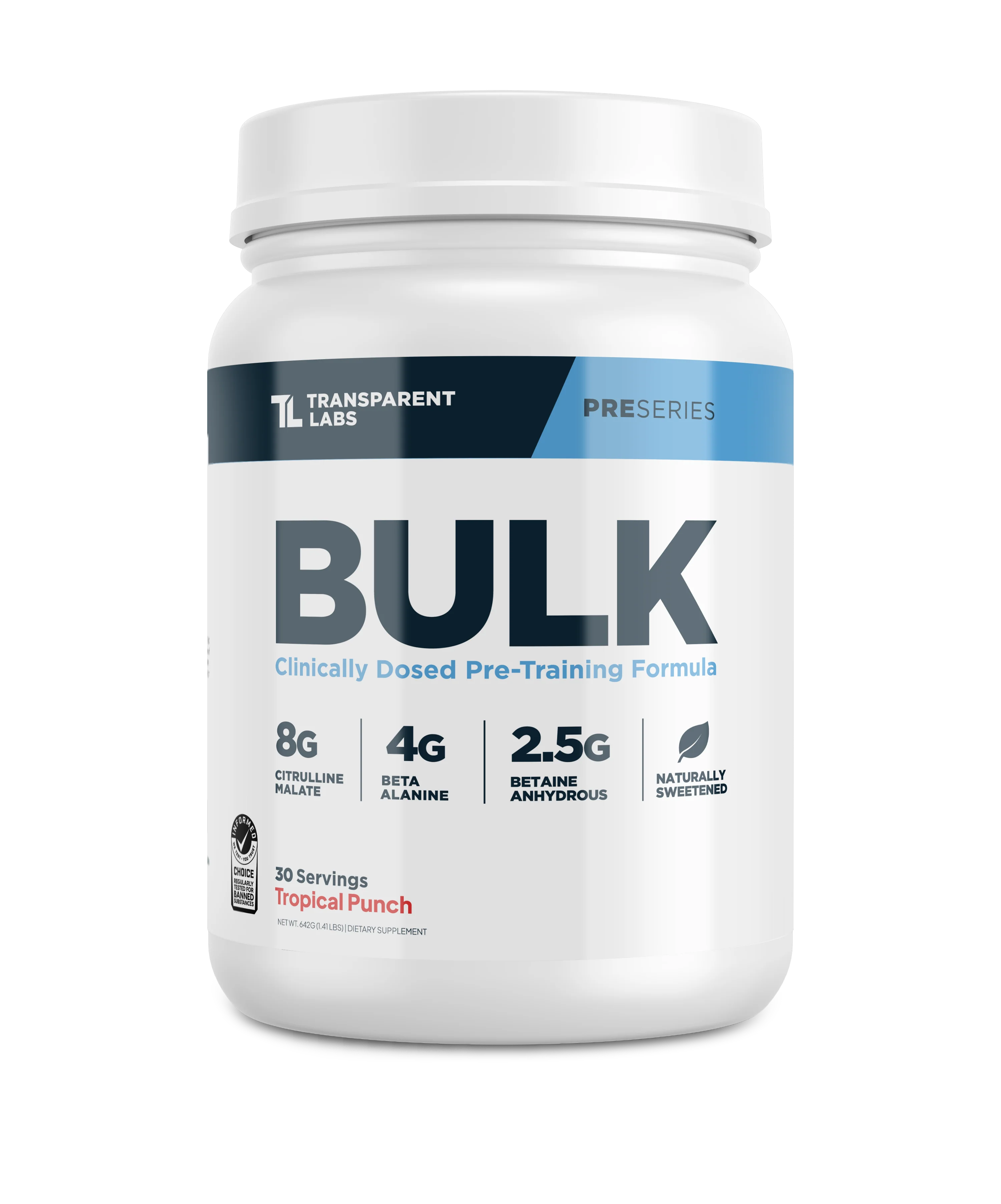 With over 17 grams of active ingredients per scoop, BULK Pre-Workout sets the stage for you to crush it in the gym and pack on lean muscle mass by enhancing muscle strength, blood flow (muscle pumps), endurance, focus, and energy.