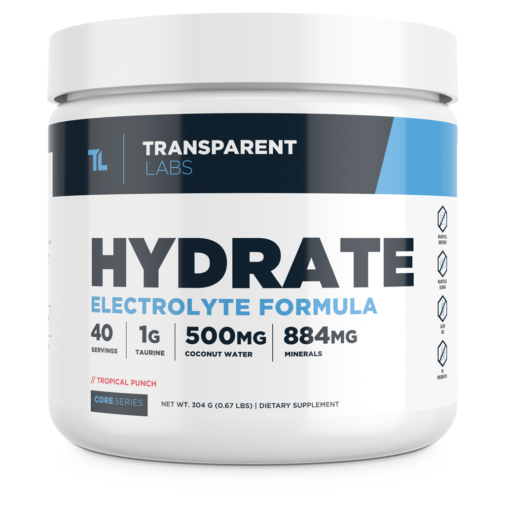 Transparent Labs Hydrate is a sugar-free electrolyte powder featuring bioavailable minerals, taurine, SenActiv®, and coconut water powder
